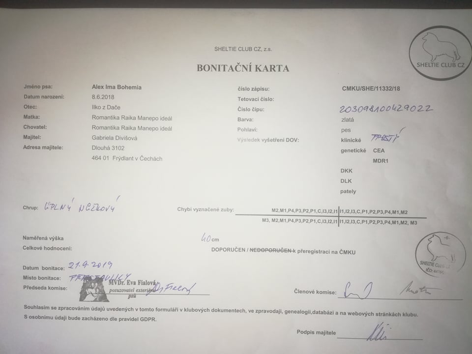 CEA DNA: +/+ - Normal - Genomia MDR1 DNA: +/+ - Normal - Genomia DM DNA: +/+ - normal - Genomia PRA DNA (rcd2): +/+ ( PRA shet) - Normal - 25.03.2021 - Genomia DKK: A/A - MVDr. Jiří Vomáčka DLK: 0/0 - MVDr. Jiří Vomáčka Luxace pately: 0/0 - MVDr. Roman Skala vWD Typ III +/+, CNGA1-PRA +/+, BBS2-PRA +/+, MH : +/+, IPD +/+, DMS aaBbCC - Low risk, HUU +/+, GBM +/+. 12.04.2022 OCD,SA,LTV - clear MVDR Jiří Vomáčka |