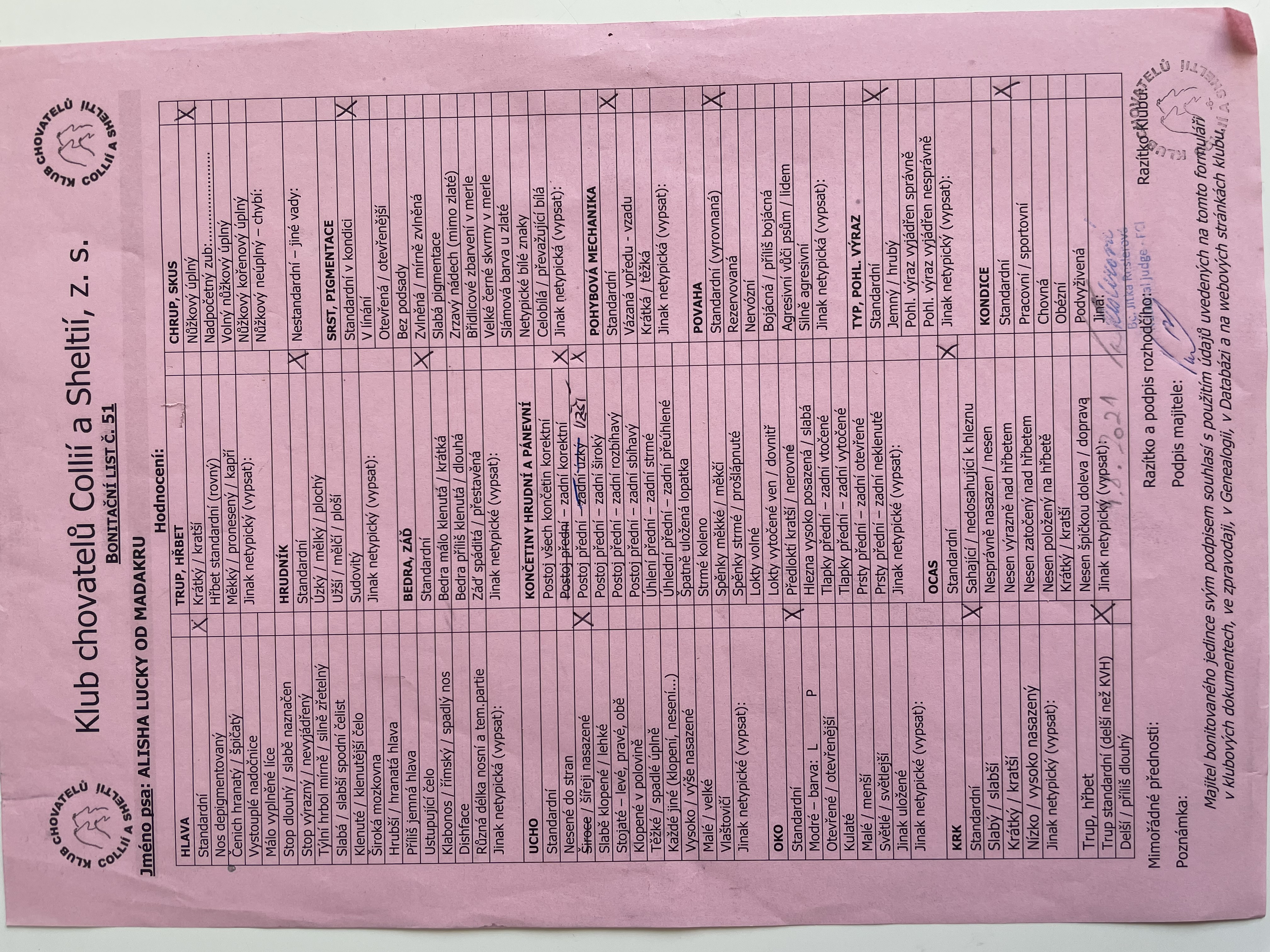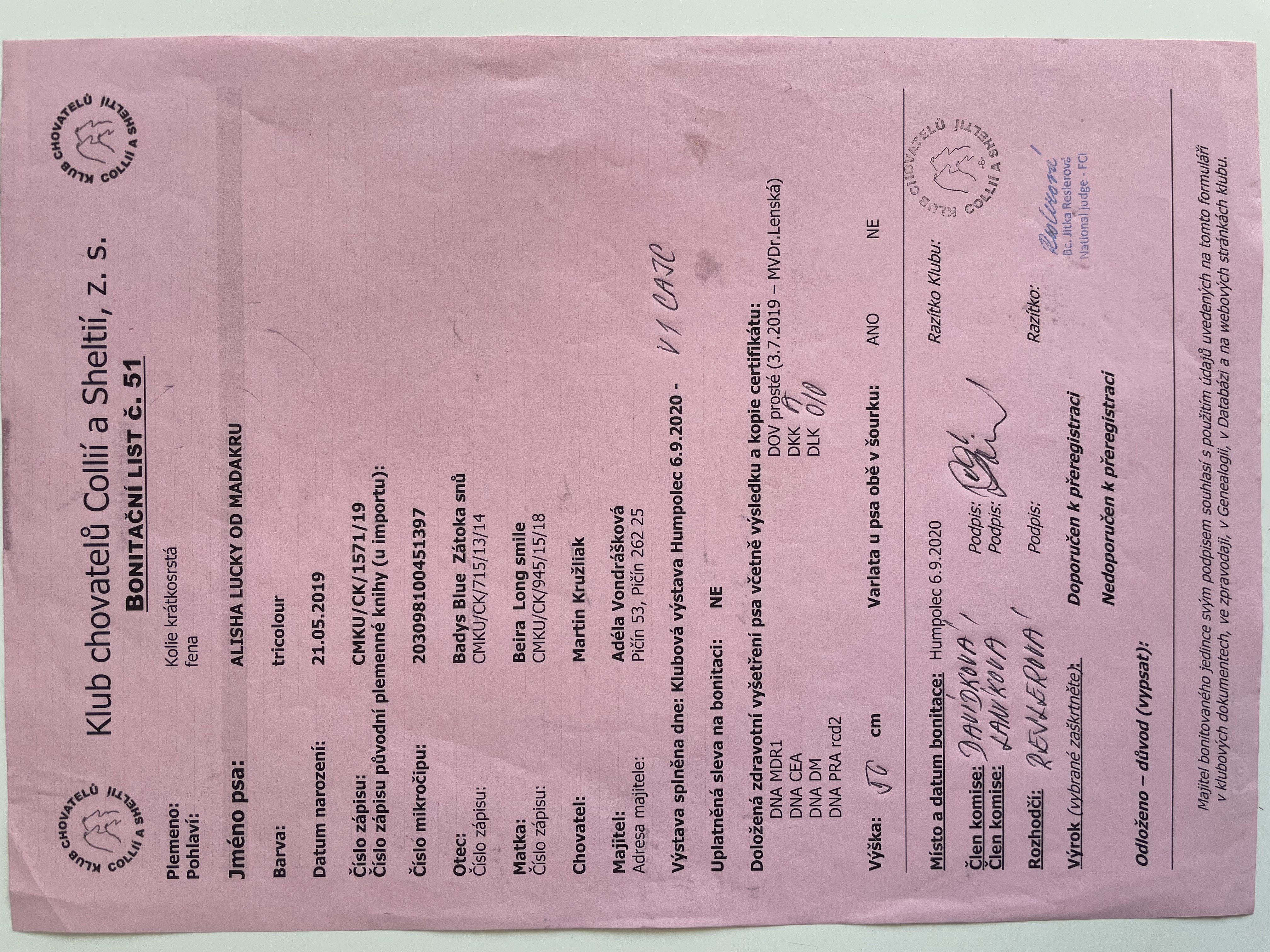 | Alisha Lucky od Madakru | fena | Krátkosrstá kolie | trikolorní, krátká | DKK: A | DLK: 0/0 | DOV: negativní | MDR1 DNA: -/- |