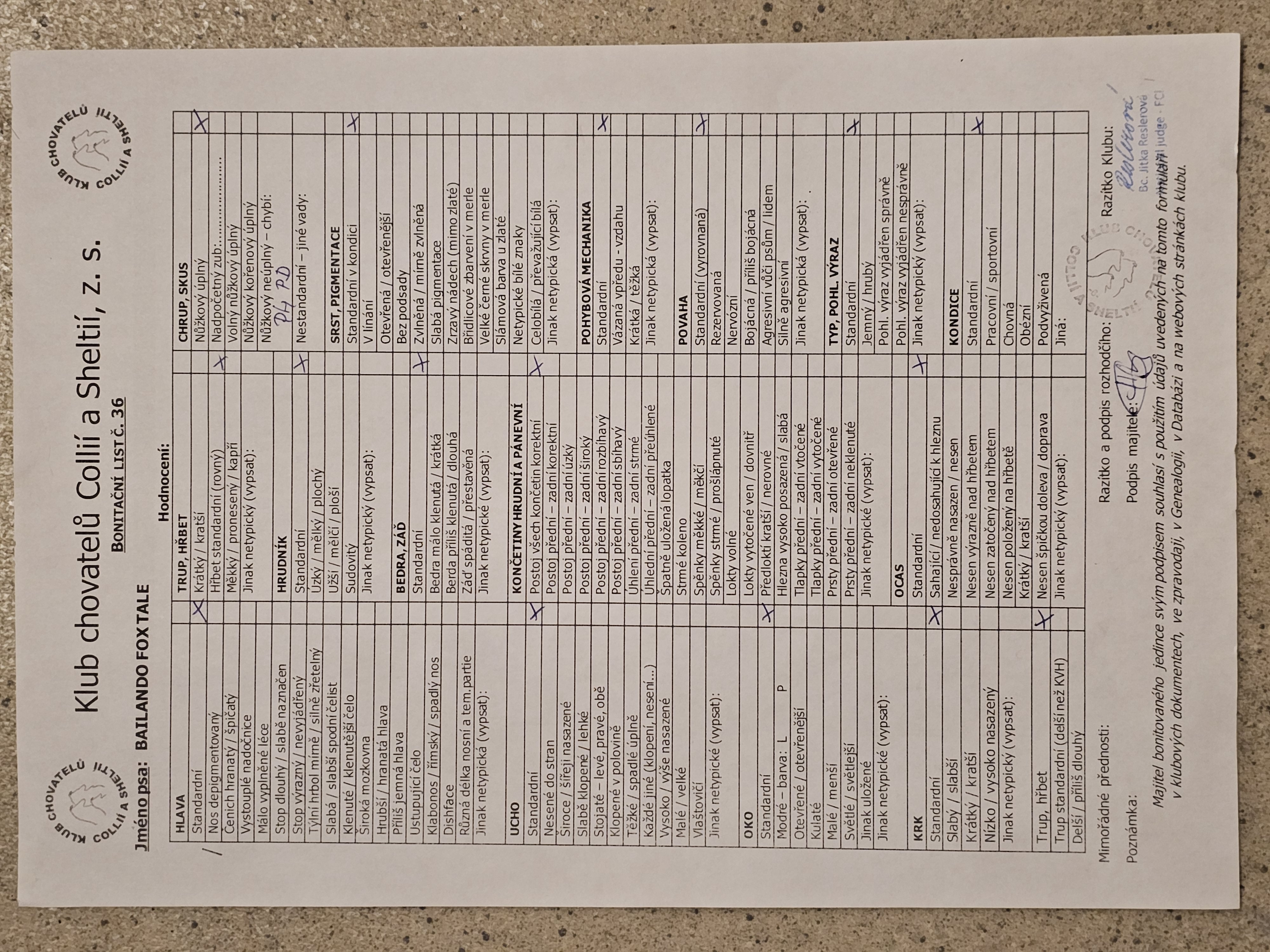 CEA DNA: +/+ - Normal - 06.04.2020 - Tilia Laboratories MDR1 DNA: +/+ - Normal - 06.10.2021 - Vedilab DKK: A - 28.02.2022 - MVDr. J. Ekr DLK: 0/0 - 28.02.2022 - MVDr. J. Ekr Luxace pately: 0/0 - 24.05.2021 - MVDr. J. Ekr |