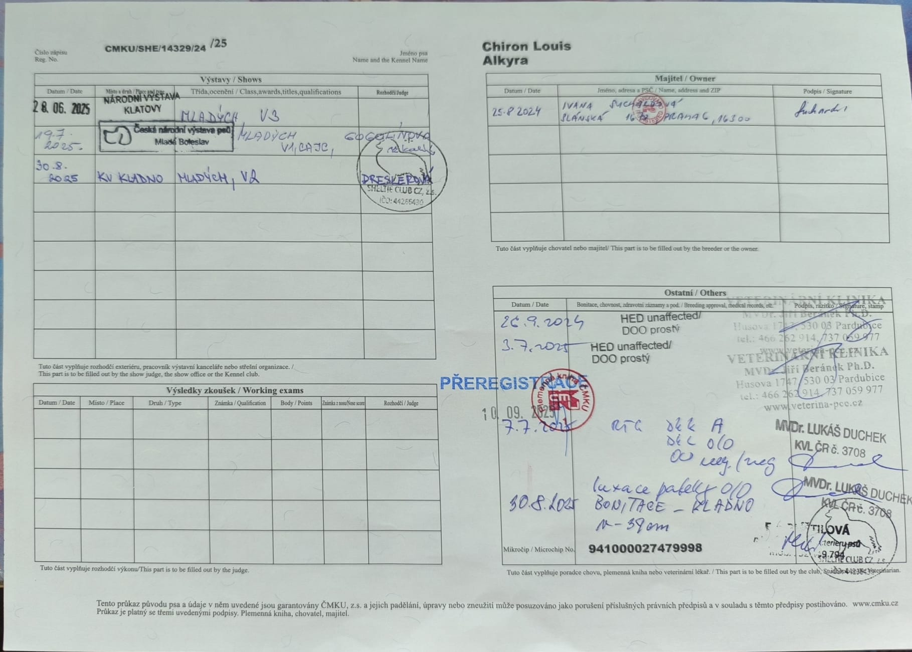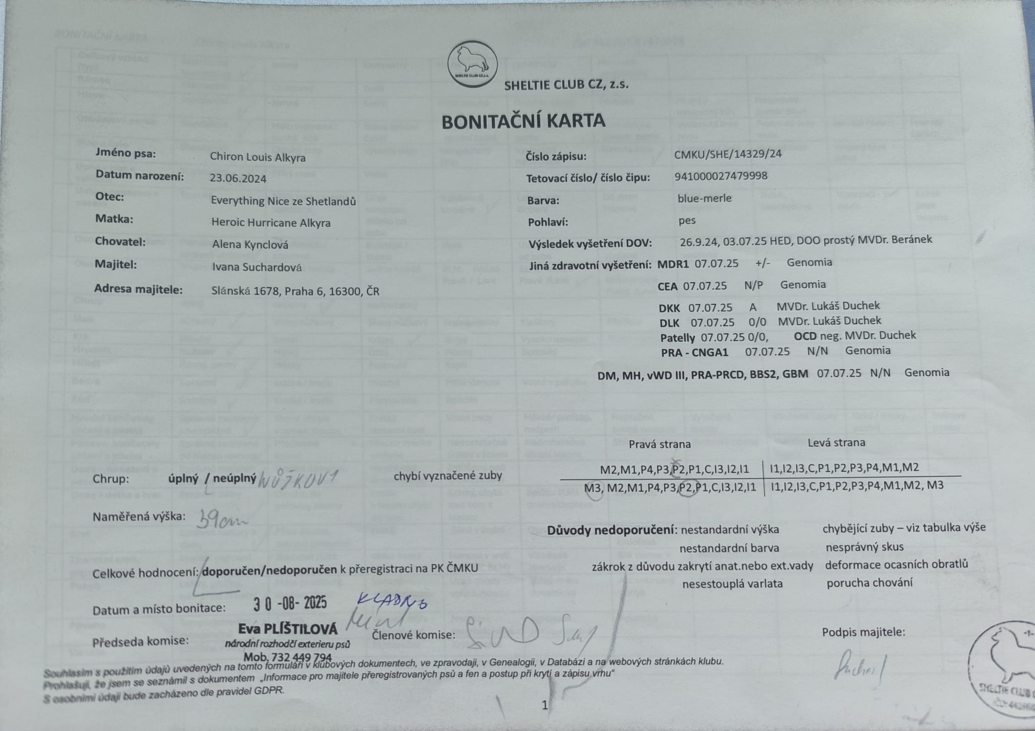 CEA DNA: +/- - Carrier - 11.10.2024 - Genomia MDR1 DNA: +/- - Carrier - 11.10.2024 - Genomia DM DNA: +/+ - Normal - 11.10.2024 - Genomia PRA DNA (rcd2): +/+ (CNGA1) - Normal - 11.10.2024 - Genomia DKK: A - 07.07.2025 - MVDr. Lukáš Duchek DLK: 0/0 - 07.07.2025 - MVDr. Lukáš Duchek Luxace pately: 0/0 - 07.07.2025 - MVDr. Lukáš Duchek vWD III, BBS2, MH, GBM +/+ normal 11.10.2024 Genomia, OCD - clear 7.7.2025 MVDr. L. Duchek |